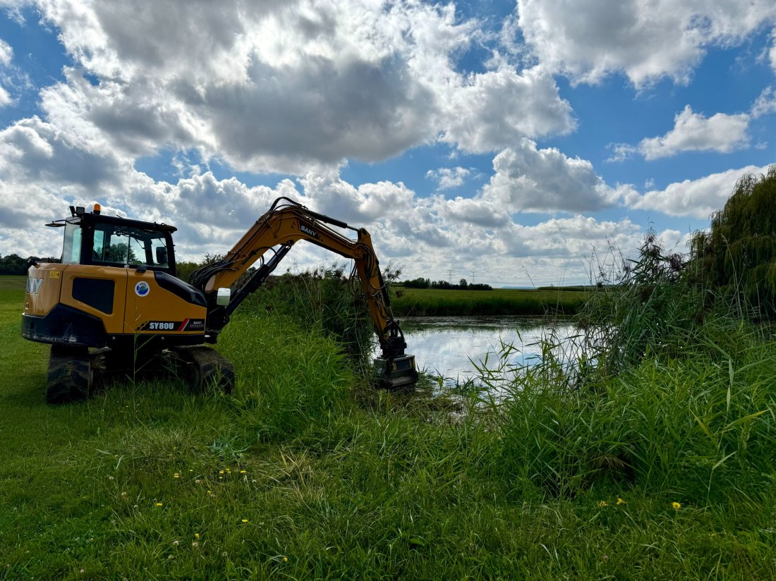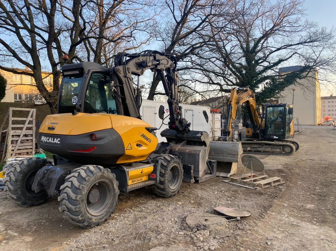 Vue dynamique d’un chantier où l’équipe VAGNER TERRASSEMENT réalise d’importants travaux dans des espaces verts, utilisant pinces et pelleteuses pour modeler le terrain avec précision et efficacité.